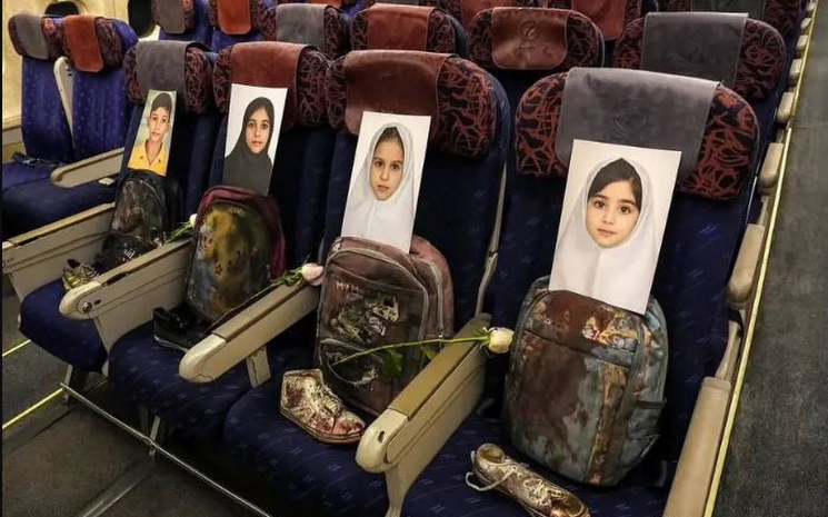 İran heyeti Pakistan uçuşu sırasında, uçağın koltuklarına Minab'da ölen çocukların fotoğraflarını koydu Ayrıca koltuklara ölen çocukların sırt çantaları ve beyaz güller yerleştirildi.