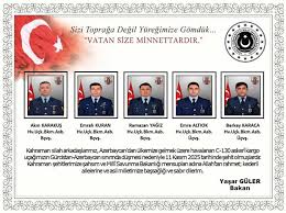 Milli Savunma Bakanı Yaşar Güler adına yayımlanan taziye mesajlarında, "Kahraman silah arkadaşlarımız, Azerbaycan'dan ülkemize gelmek üzere havalanan C-130 askeri kargo uçağımızın Gürcistan-Azerbaycan sınırında düşmesi nedeniyle 11 Kasım 2025 tarihinde şehit olmuşlardır." denildi.